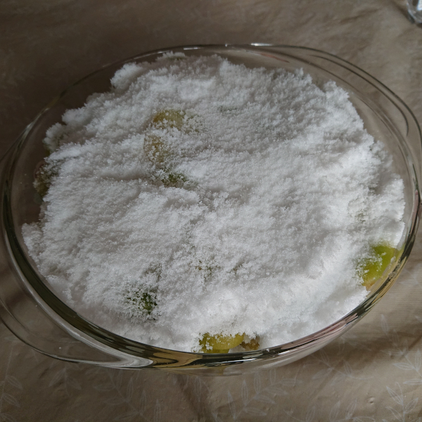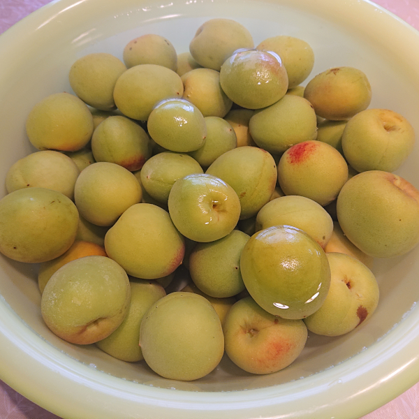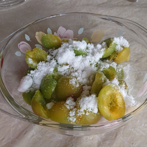 2023.06.25 青梅の砂糖漬け 地元特産の梅でつくる青梅の砂糖漬け 材料 青梅:1Kg 塩:100g 焼酎35度:適量 砂糖:800g ①青梅は丁寧に水で洗い、2〜4時間たっぷりの水に漬けてアクを抜く (前回の梅ジュースは熱湯に漬けたけど、今回は熱湯には漬けない) ②水気を十分にきり、へたを取る ③梅に焼酎をからめ、塩をまぶす ひと粒ひと粒丁寧に、塩をなじませ、3時間程度おく ④梅を水洗いして、塩気を洗い流す ⑤水気をしっかり拭き取る ⑥包丁で半分に切り目を入れ、種を取る。 種のとり方:切り目を入れた梅をまな板に置き、両手で体重をかけて潰すと、簡単に取れます。 ⑦殺菌した容器に、梅と砂糖を交互に入れる ⑧冷蔵庫で保存し、ときどき混ぜる 砂糖が溶けたら完成 秋間梅林/安中市