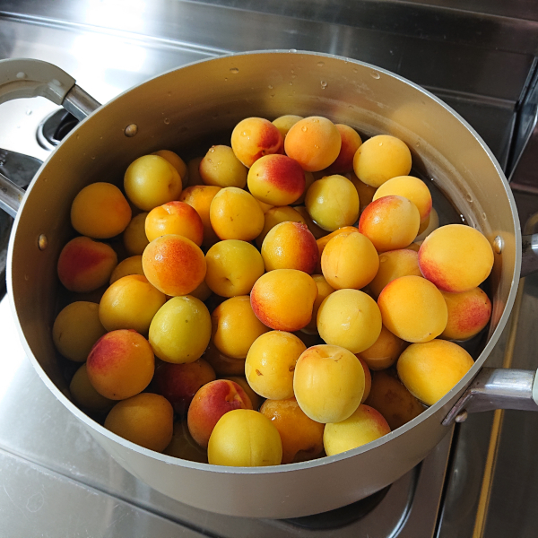 鍋にヘタをとった梅と水6カップを入れて火にかける